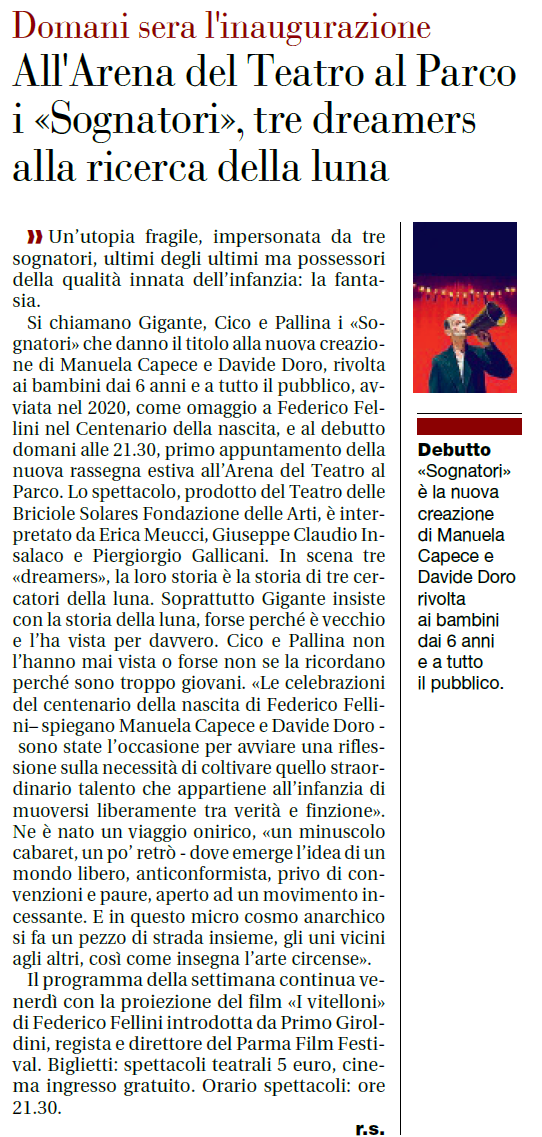 Al Parco Ducale di Parma la rassegna estiva realizzata dal Teatro Delle Briciole Solares Fondazione delle Arti propone venti appuntamenti e tre laboratori tra teatro e cinema. Dal 24 giugno al 30 luglio 2021.